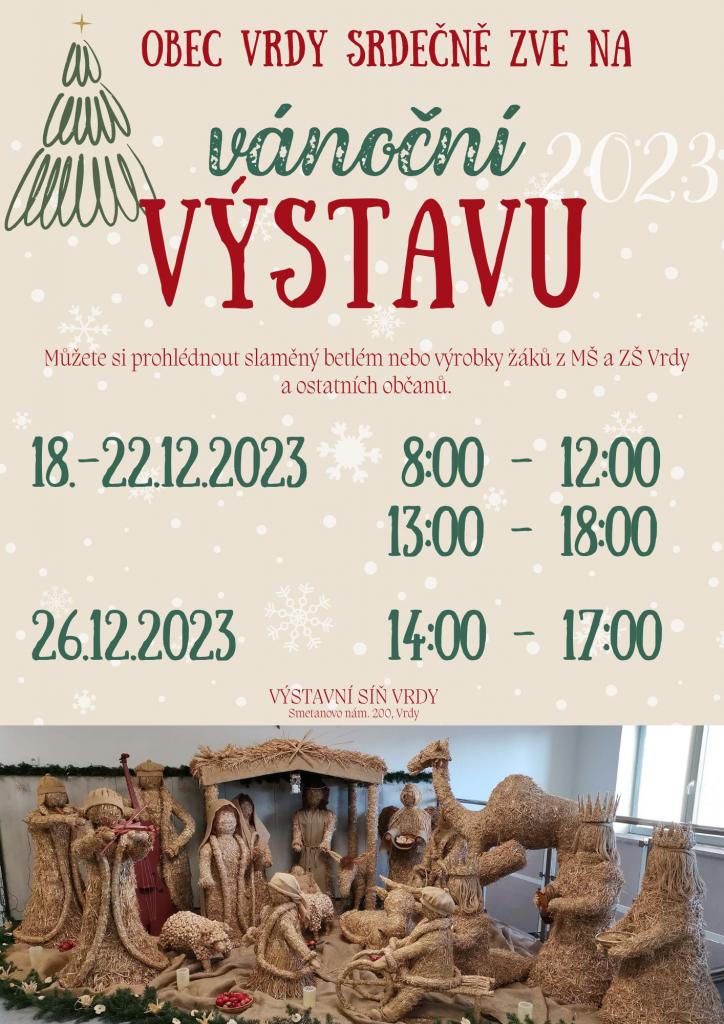 Obec Vrdy zve na vánoční výstavu, která bude probíhat ve dnech 18.-22.12.2023 a 26.12.2023 ve výstavní síni ve Vrdech.