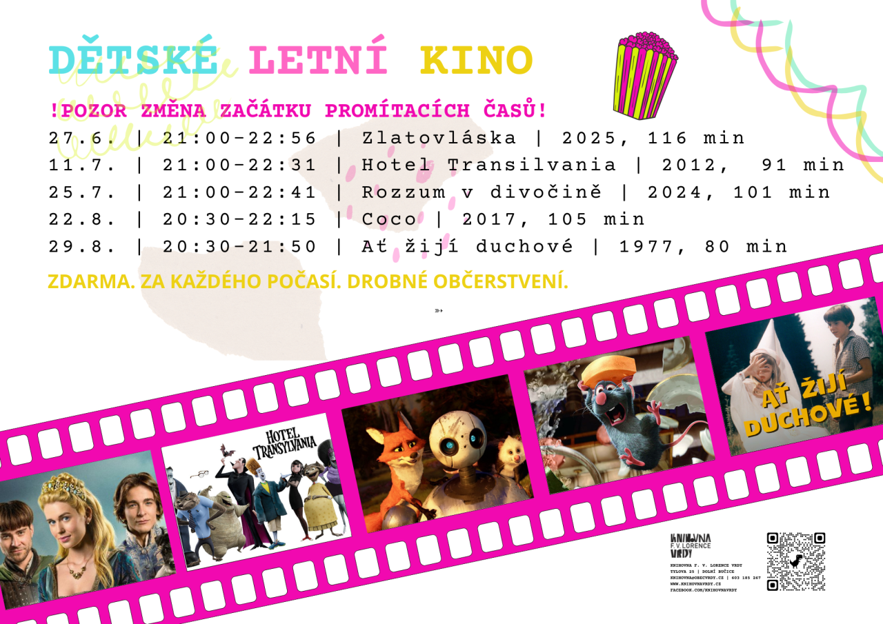 Knihovna Vrdy srdečně zve všechny děti a jejich dospělé na první letošní promítání Dětského letního kina. V pátek 27. 6. se těšte na nové zpracování pohádky Zlatovláska. Začátek promítání již od 21:00. Promítáme za každého počasí a zdarma. K dispozici drobné občerstvení. Více na www.knihovnavrdy.cz.