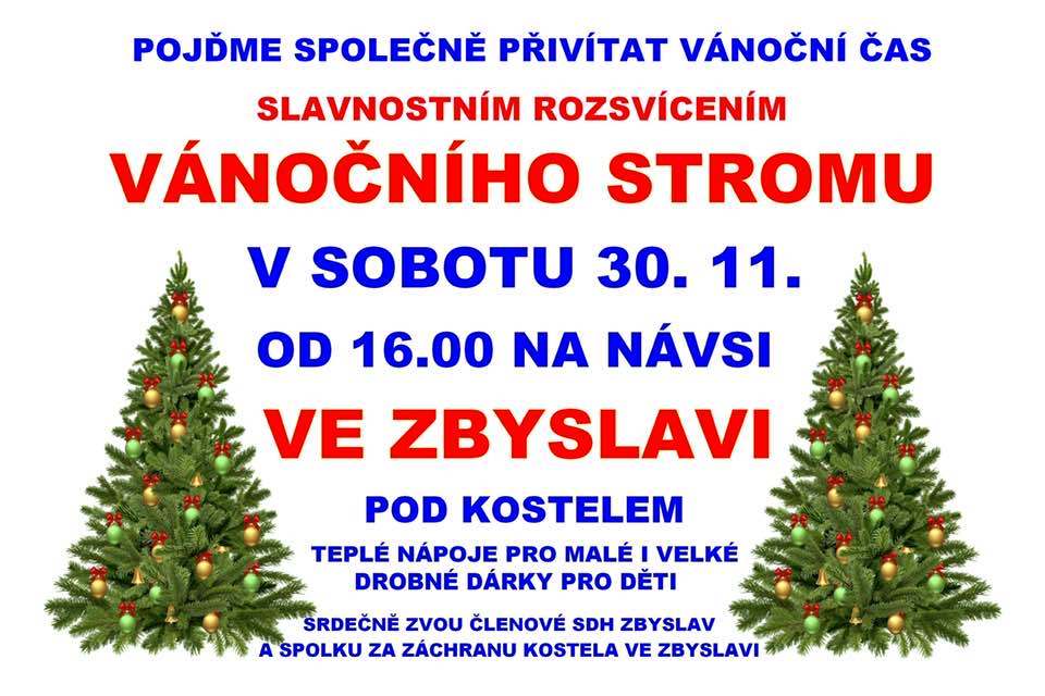 SDH Zbyslav a Spolek za záchranu kostela ve Zbyslavi zve na rozsvícení vánočního stromu, které se koná 30.11.2024 od 16:00 hod. na návsi ve Zbyslavi pod kostelem.