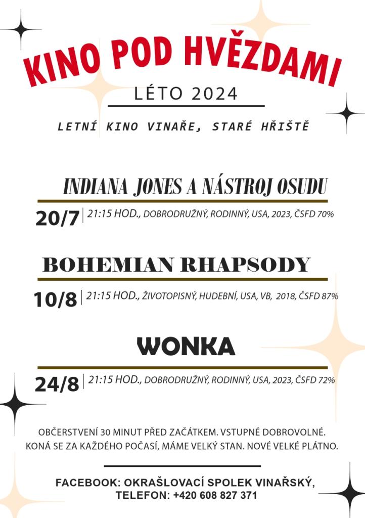 Okrašlovací spolek Vinařský zve na promítání letního kina, které se nachází na starém hřišti ve Vinařích. Koná se za každého počasí.